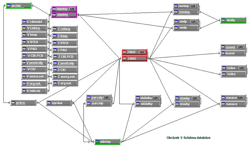 Schématicky je vlastní databáze znázorněna na obr. 1. Obdélníky znázorňují datové tabulky s jejich názvy. Tabulky označené zkratkou GIS reprezentují datovou základnu vrstev GIS a nejsou obsaženy ve vlastním databázovém souboru. Jsou pouze propojeny volnou relační vazbou s vlastní databází. Kromě tabulek uvedených ve schématu obsahuje databáze ještě řadu podpůrných tabulek, z nichž jsou čerpány nabídkové informace pro vyplňování jednotlivých položek, tj. menu a seznamy klíčových slov atp.. Vlastní databázové vazby jsou poněkud složitější než-li ukazuje schéma na obr. 1. Příklad detailního propojení vazeb mezi tabulkou „adresy" a tabulkou „sprava" je patrný z obr. 2.