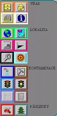 Okna se otevírají tak, aby nepřekrývala hlavní datové údaje ani informační tlačítkový panel. Barevné ikony panelu vypovídají o existenci či absenci dalších údajů v databázi k aktuálně zobrazené zátěži životního prostředí. Tzn., že již při zběžném pohledu na úvodní obrazovku je zřejmé, zda k příslušné zátěži životního prostředí jsou známy vlastnické vztahy, zdroje kontaminace, skládky, prováděné práce, průzkumné a pozorovací objekty, zda existuje vymezení kontaminovaných vod či zemin, rizik a ploch určených k sanaci. Při pohybu databází od zátěže k zátěži se mění barevné rámování tlačítek a jejich vlastní vzhled v závislosti na tom, zda část databáze, která je spouštěna daným tlačítkem obsahuje data k aktuální zátěži, či nikoli. Proto ve většině případů se jeví obrazovka barevně klidná, s ojedinělými výraznými tlačítky, která signalizují existenci podrobnějších údajů. Další tlačítka jsou zastřená a šedá.