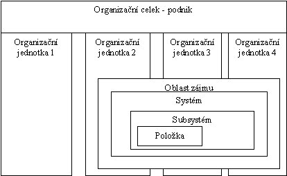 Navrhovaný systém je chápán jako soubor funkcí, který je navrhován jako entita v různých typech organizací v rámci jedné či více organizačních jednotek. Pokrývá – li systém více organizačních jednotek, je třeba vymezit společnou oblast zájmu systému. Celý systém se často dělí na dílčí subsystémy jako implementační jednotky, které se skládají z jednotlivých položek (hardware, software, procesy s lidmi).
