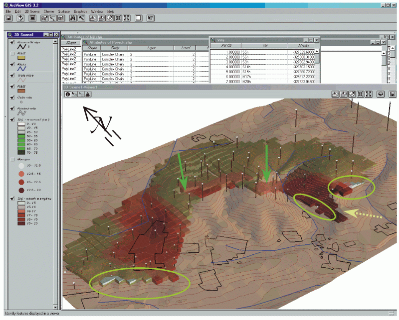 Fig. 10. A top up view of the GIS data: In the upper part a portion of the database table is shown, below it, the topographical situation and the deposit layout and ore grades are shown. Green arrows point to the Northern fault, the yellow, dotted arrow point to the Prímovce fault. Ellipses encircle the deposit outcrops. The vertical scale of the deposit is enhanced to enable better visibility. (view in the full resolution)