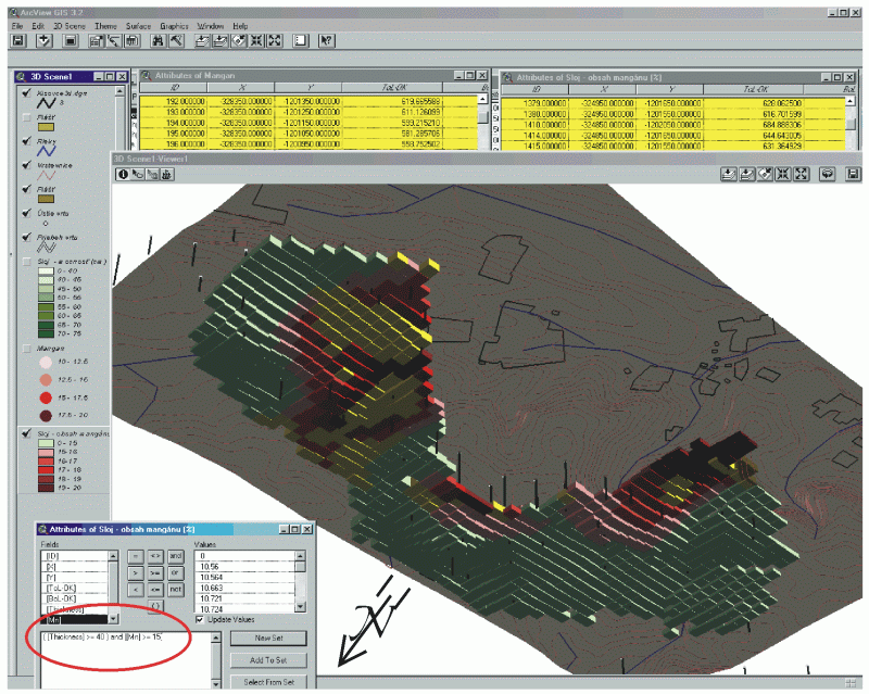 The developed GIS project enabled the visual modelling of the deposit and he visual modelling of search results for various selection criteria (e.g. for seam thickness greater or equal to 0.4m and Mn content greater or equal to 15% - see Fig. 11). Fig. 10 shows a top view of the distribution of various ore grades in the deposit.