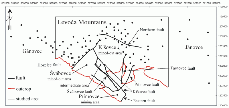 For the study we had at our disposal the records of an irregular grid of boreholes localised in the studied part of the Levoča Mts (Fig. 2). Apart from that we could also use a 1:5 000 and 1:10 000 (Antonická et. al., 1999) geological map that contained the course of the main geological faults as well as the outcrops of the deposit and the elevation isolines of the terrain. The records were used for developing a drillhole database.