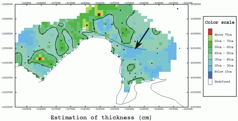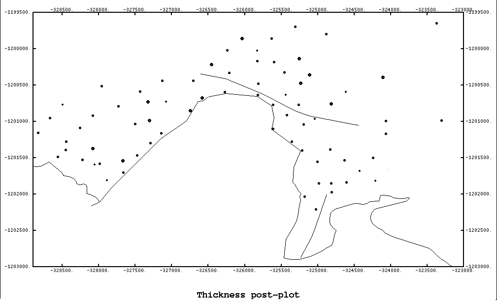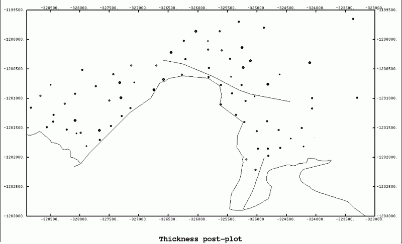 Fig. 8 shows the estimation of seam thickness (in cm) together with the porportional post-plot of experimental thickness data calculated according to equation [2]. The isoline shown represents a 40cm thickness contour. The 40 cm value was the cut-off thickness at the time of mining of the deposit.