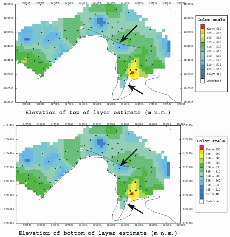 On the basis of the described theoretical model the multivariate estimation of the top and bottom elevations for blocks of 100x100m. Fig. 7 shows the resulting estimations of elevations that show a high correlation coefficient value similar to that of the experimental data.