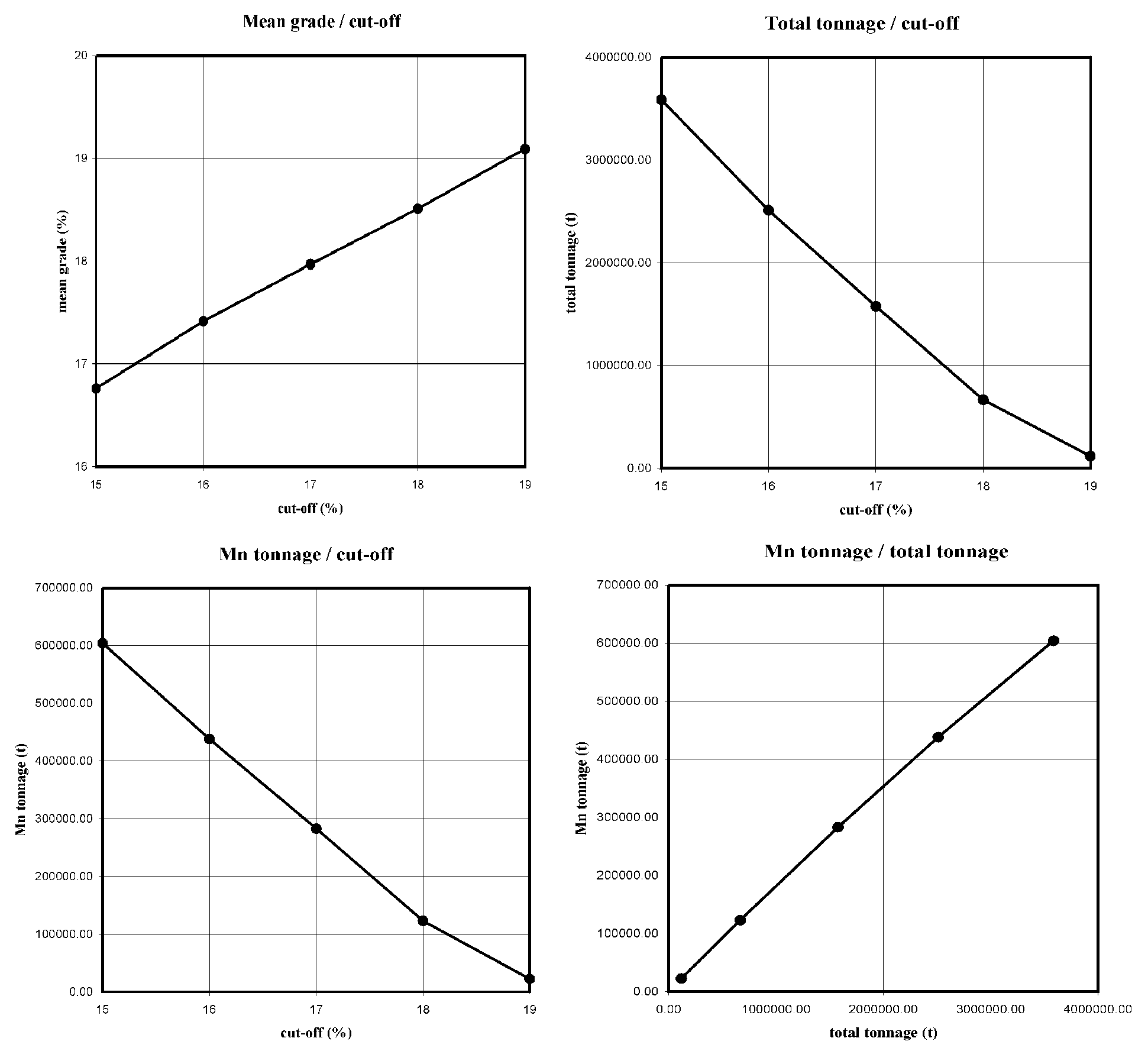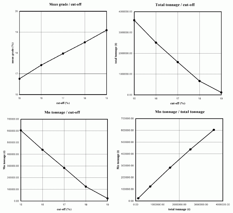Tab. 5 contains the calculated average Mn content, of the tonnage and grade for a 15%, 16%, 17%, 18% and 19% cut-off level. Fig. 9 shows the grade/tonnage curves.